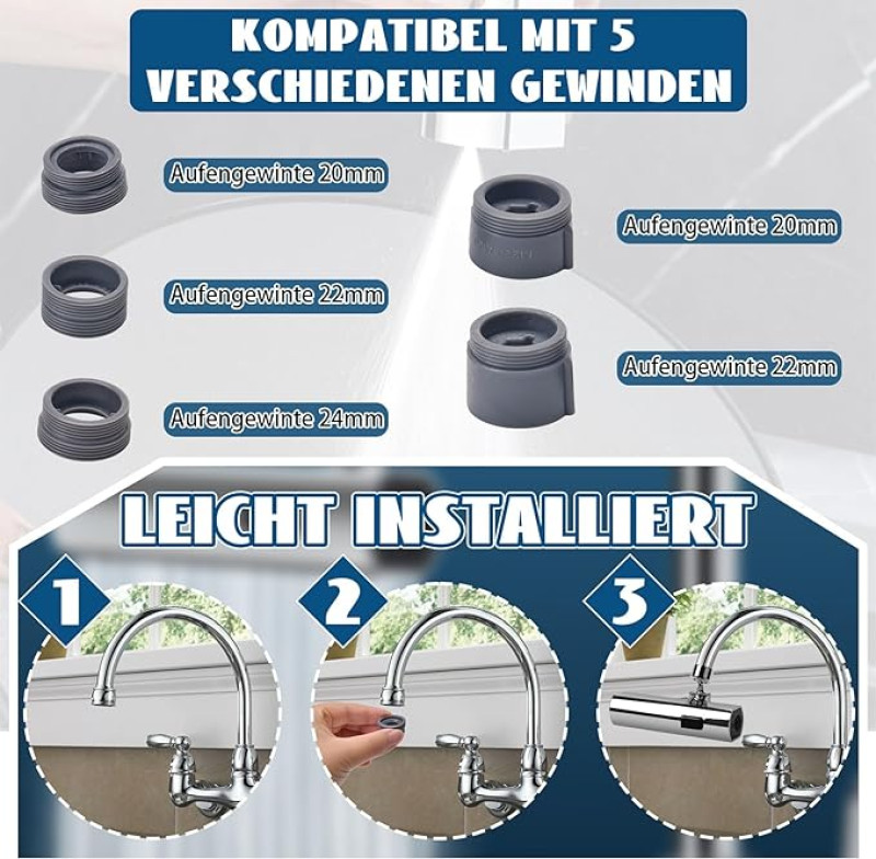 - سهل التركيب، جهاز تهوية الصنبور سهل التركيب والإزالة للتنظيف. ببساطة قم بفك مهوية الصنبور الأصلية واستبدلها بموسع الصنبور هذا. أكمل التثبيت في دقيقتين. يتم تركيبه يدويًا مباشرة بدون أدوات، ويتم ذلك في ثوانٍ.